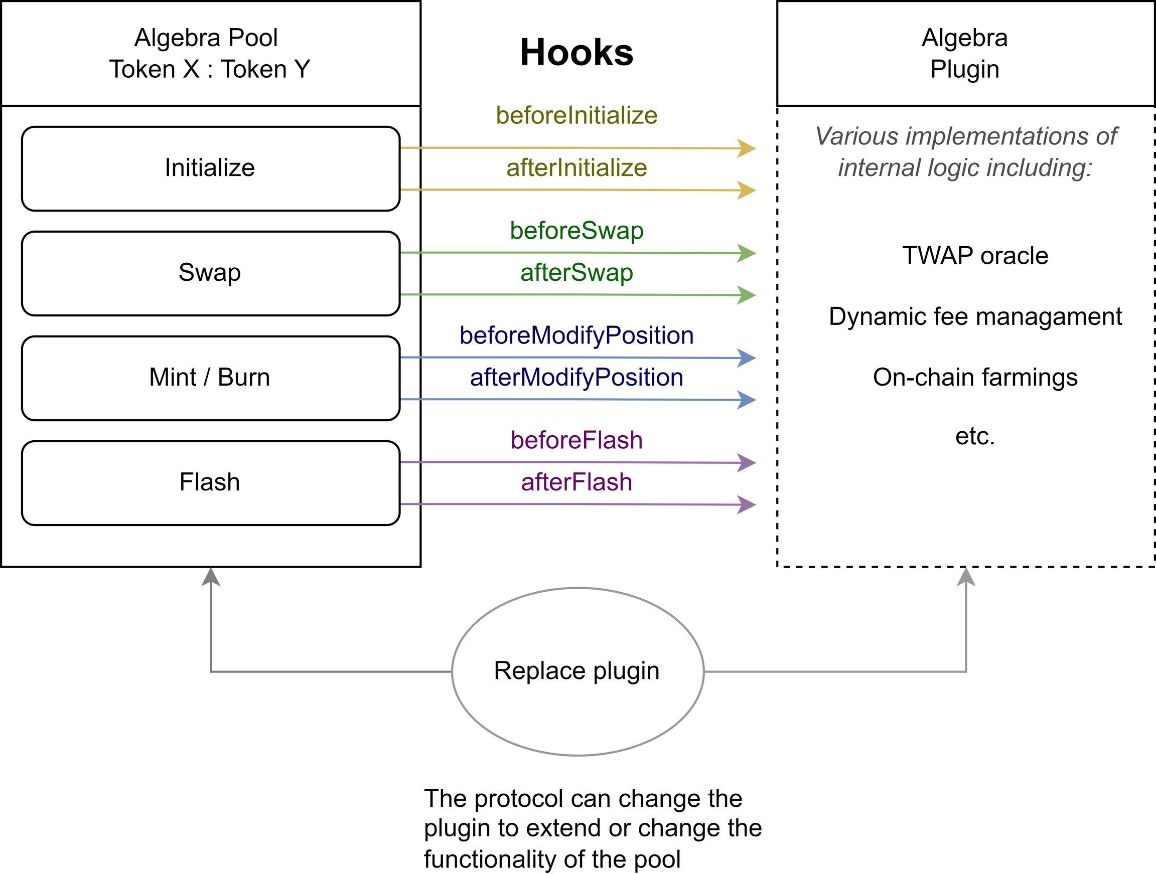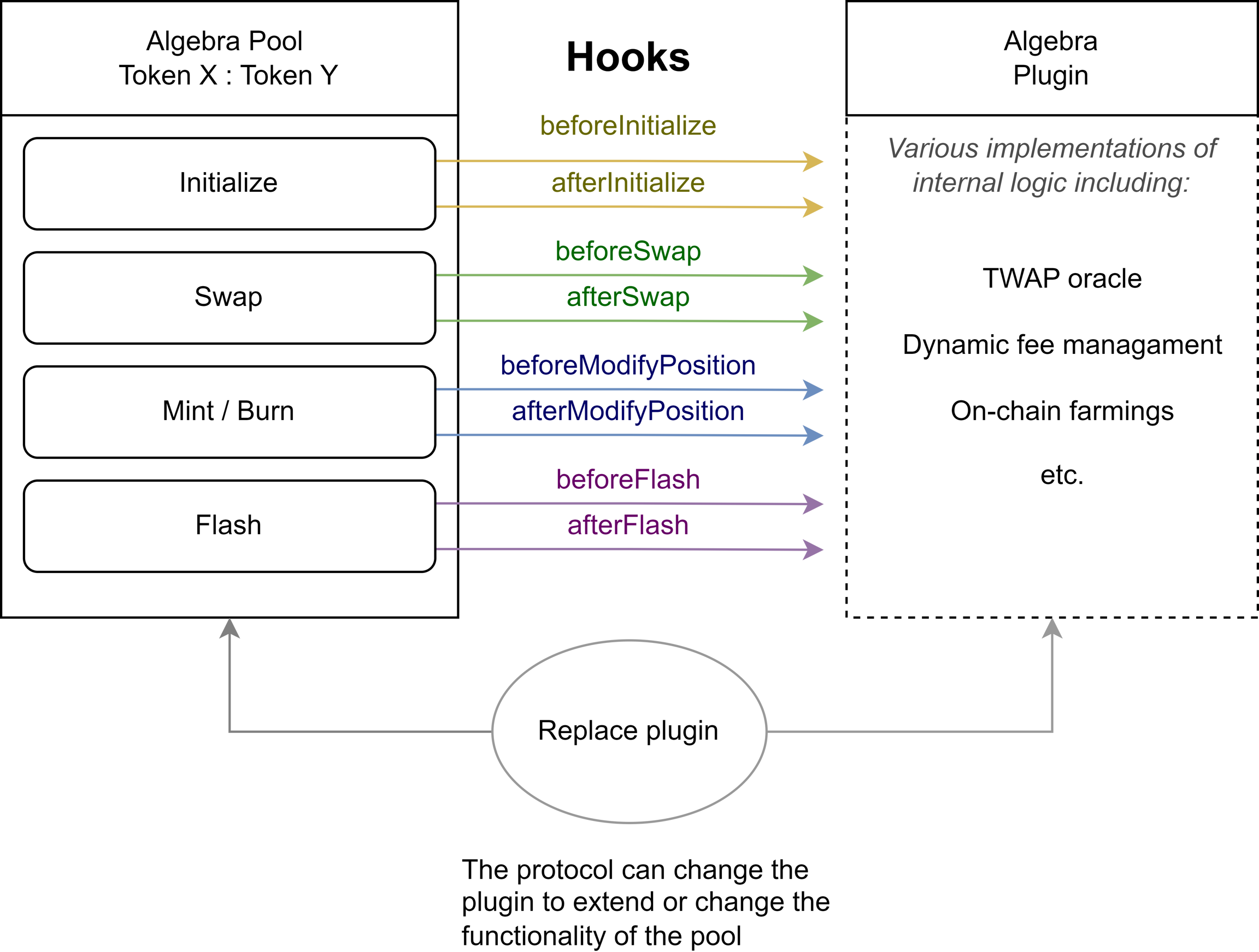 If a plugin is attached to the pool and a setting corresponding to a given hook is activated, the liquidity pool will call a function defined in the Algebra plugin interface from the plugin. Within this function, arbitrary logic can be implemented in the plugin, including including interaction with the same liquidity pool.