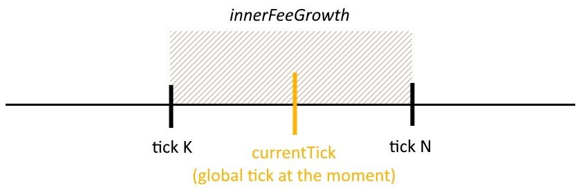 it is possible to know the accumulator increment within the range specified by any two active ticks at any time. Distribution of commission among liquidity positions is performed by tracking the change of innerFeeGrowth