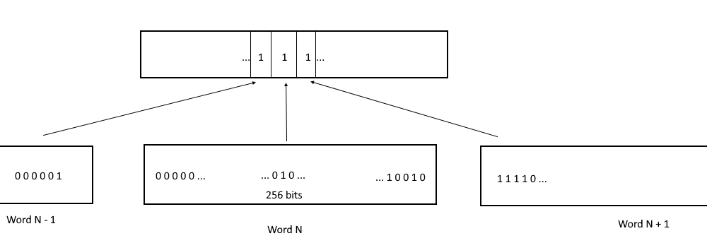 Since one tickTable word can only store information about 256 ticks, another layer of bitmaps is added. In the intermediate layer, each word contains information about words from tickTable. Each bit in a word from the intermediate layer corresponds to a word from the leaf layer (tickTable) and is 1 if at least one bit in the corresponding word is 1 (at least one tick is active).