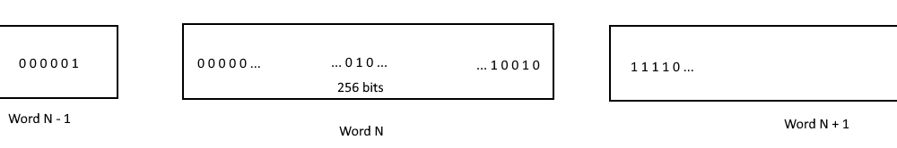All ticks are divided into "bundles" of 256 and packed into bitmaps. This structure is called tickTable. tickTable consists of "words" in which each bit corresponds to a tick. If a bit is 1, the tick is active. If the bit is 0, the tick is not active. Indexing of ticks in tickTable goes from right to left, i.e. tick with index 0 in a word is the lowest bit.