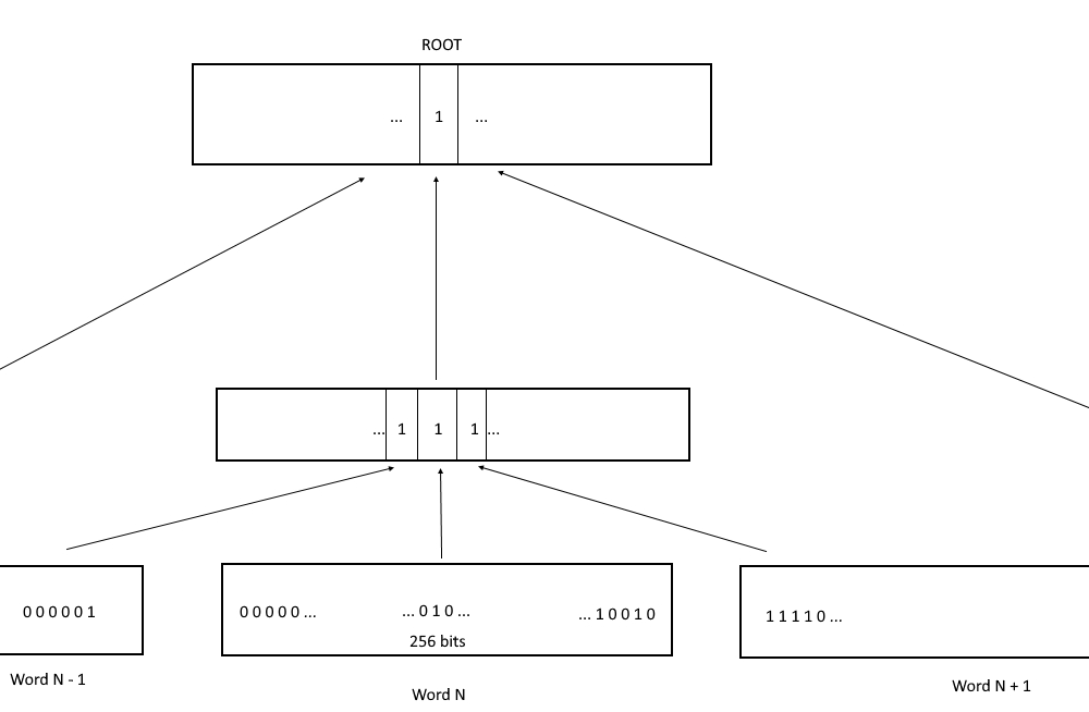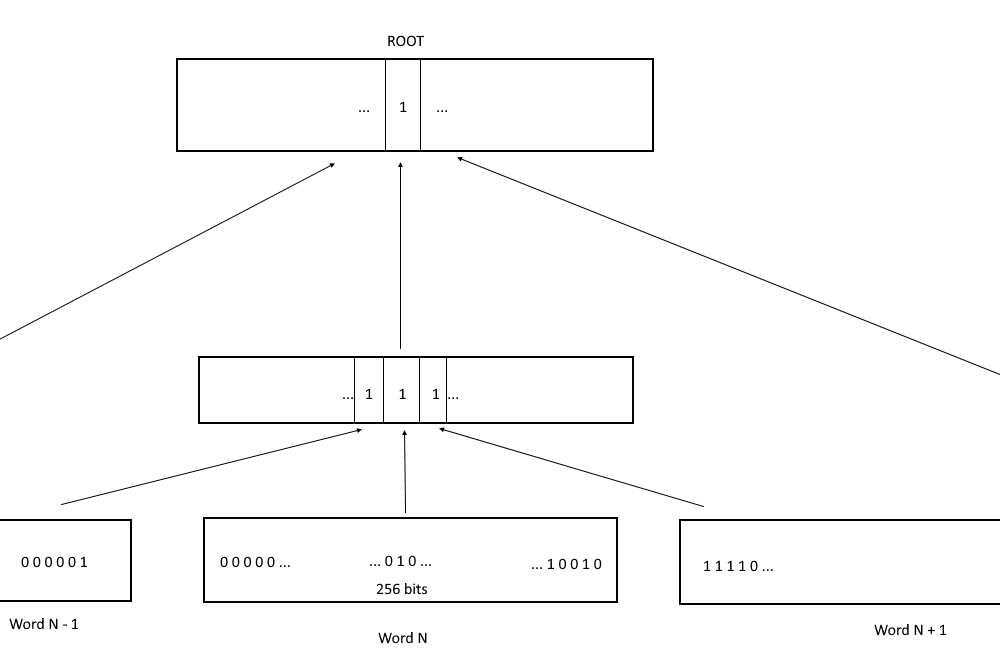 The root of the tree is also a bitmap and contains information about the words of the second (intermediate) level.