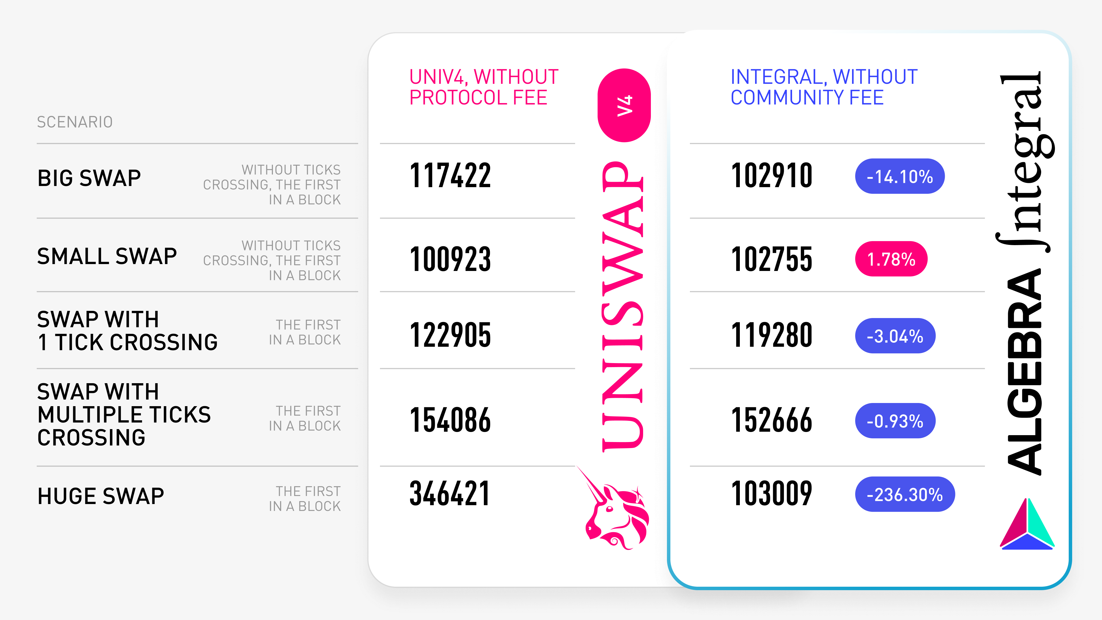 Algebra Integral's core is engineered for optimal gas usage, delivering 7–22% savings compared to Uniswap V3.